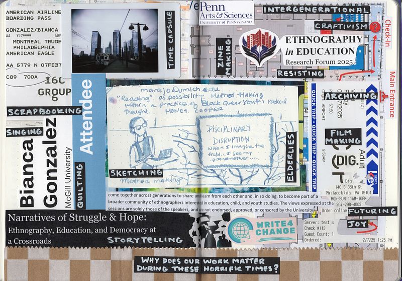 I began junk journaling during my trips to conferences as a way of processing and documenting my experiences navigating privileged academic spaces as a first-generation graduate student. This particular junk journal was created during and after my most recent trip to Philadelphia, Pennsylvania, for the Ethnography in Education Forum (February 7th-8th, 2025).